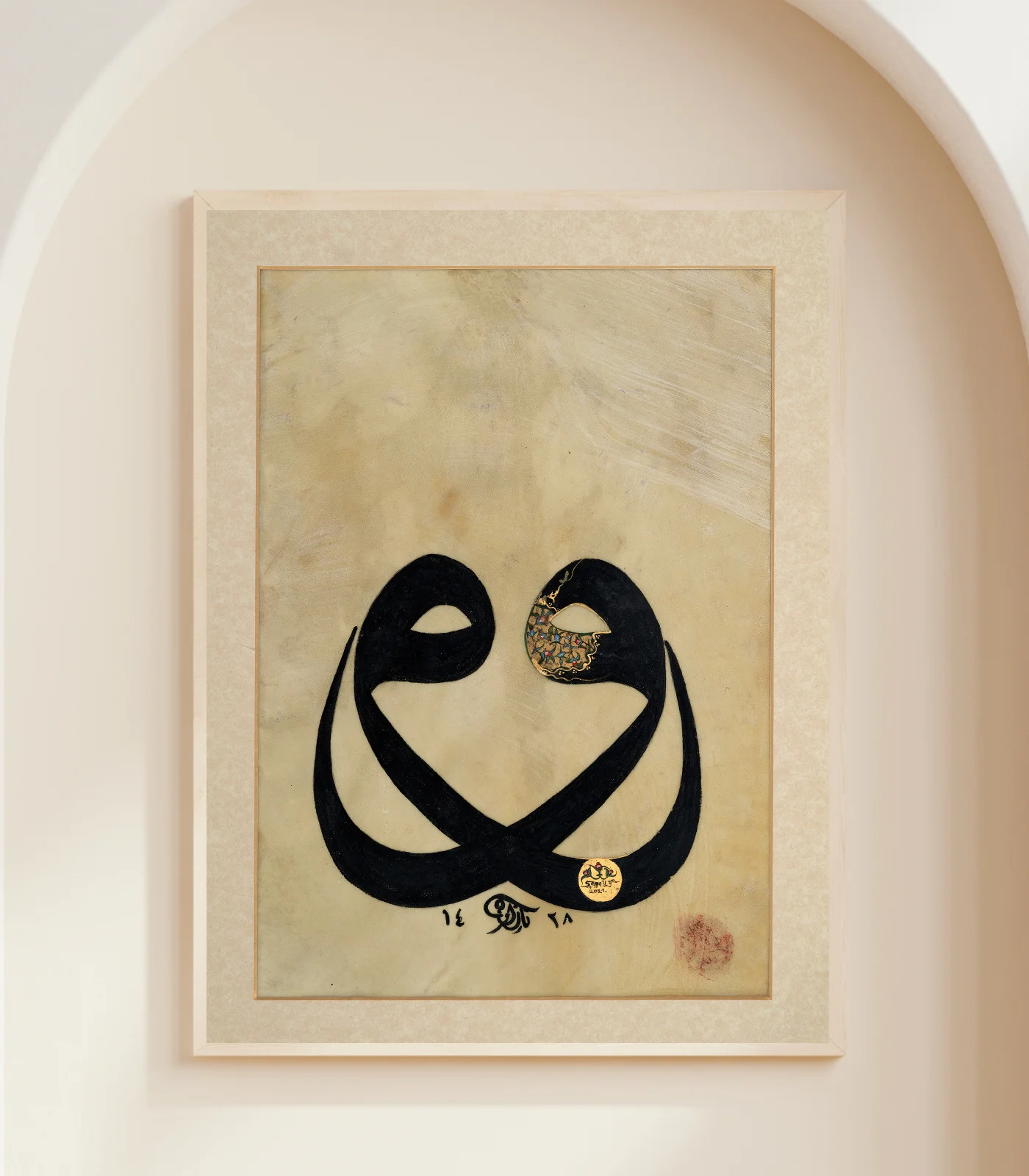 The calligraphy in this artwork is Double Waw. Calligraphers, especially in Ottoman Era, especially attached great importance to the double way. In the written Double waw is an ornamental art developed by Ottoman calligraphers in the 17th century. In the Abjad calculation, waw is the equivalent of the number 6. Double ‘waw’ means 66, which correspondes to the name of Allah in Abjad.