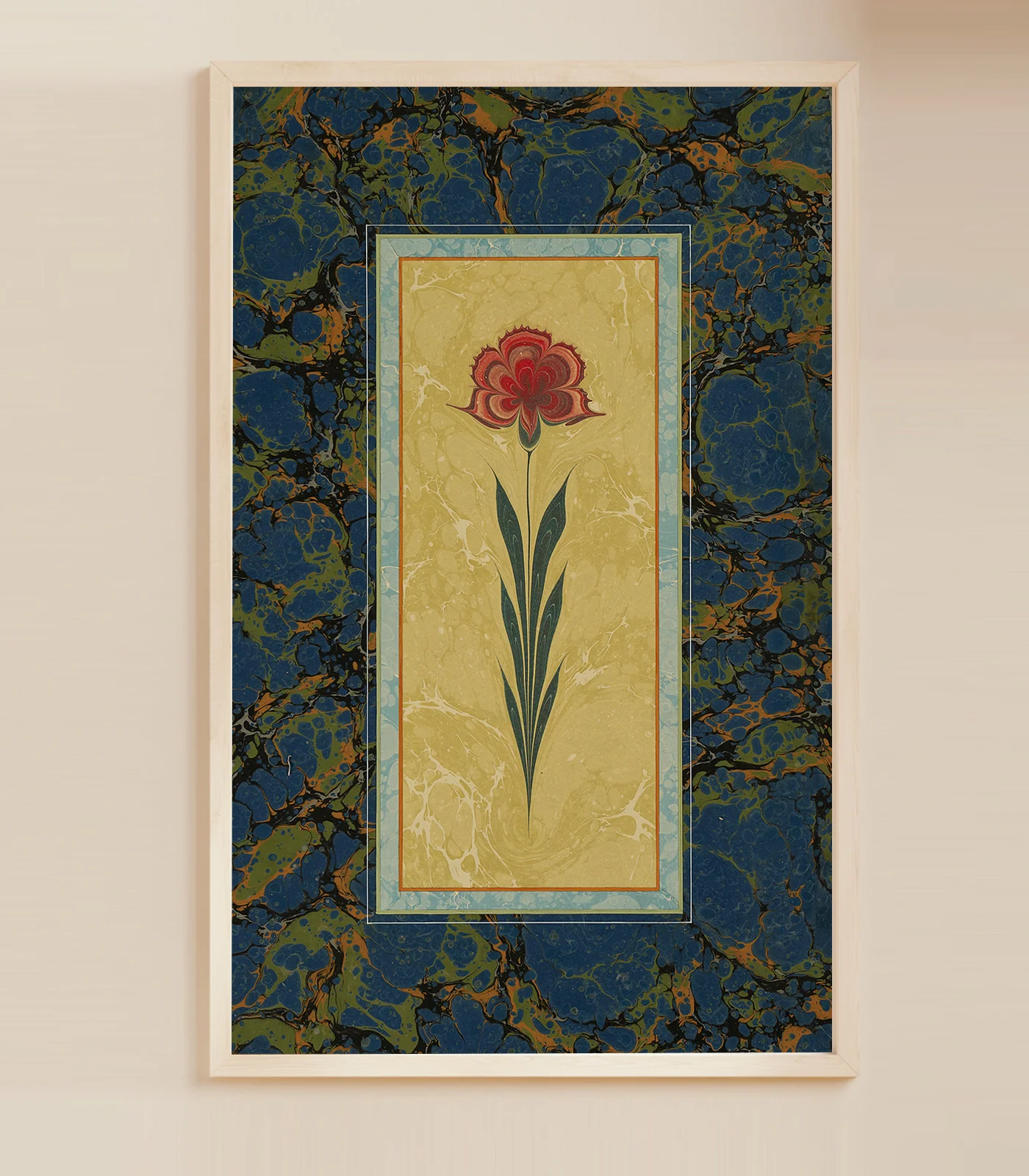 This piece includes a mosaic of three marbling artworks: battal ebru (stone pattern), çiçek ebru (floral), and zemin ebru (background / base), all designed to complement one another. The carnation, symbolising spring and renewal, is the centrepiece of this work of art, and is a prominent floral pattern not only in marbling but also in other traditional Turkish arts. Çiçek ebrusu (floral marbling), is one of the most important features that distinguishes Turkish marbling from other examples of marbling works around the world. Flowers unique to Turkish-Ottoman culture bloom in the marbling tray with the artists’ touches on the water. The artist has used battal ebru style, one of the most common marbling patterns, when designing the painting’s outer frame. Using zemin (background or base) ebru style to create the inner frame, she used a lighter colour to serve as a background for the flower.